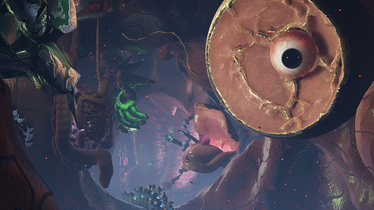 The arrival in our lives of new devices such as the smartphone has led us to see, use, and extend our bodies in novel ways. nerd_funk’s »Chapter 1: #ray_oscopy (post_body)« focuses on how virtual reality can provide a foretaste of post-bodily experience, by implying a new consciousness of one’s own body and the extension of physical and mental capacities. After emerging from a dense thicket– phone in hand– the visitor’s virtual path meanders through a cavern-like space with living walls presenting body parts in bizarre, disorienting juxtapositions. The walls have random holes through which the visitor discovers videos collected from Instagram, referring to the post-body age from diverse viewpoints: biotechnology, animatronics, life sciences, performance art… a tunnel lined with a hallucinogenic array of selfies and avatars modified with filters, representing new ways of self-display. This slowly emerges into a dystopian wilderness under the stars, with a multi-screen performance alluding to the dangers of new technologies.
