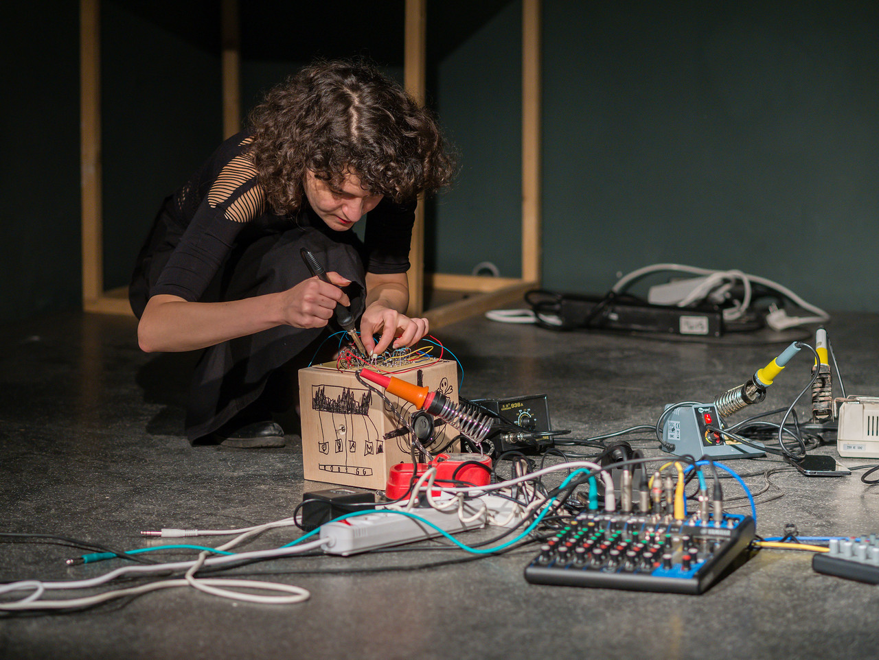 In her practice, Moser uses rough electronic processes to obtain different materialities of sound. She places electronic components and control voltages in different situations of interaction with her body, organic materials, lost and found items, and environmental stimuli. From these collisions, synthesised sounds emerge to carry personal narrations and observations on electronics' history, production chains, wastelands, and entanglements in the natural world.