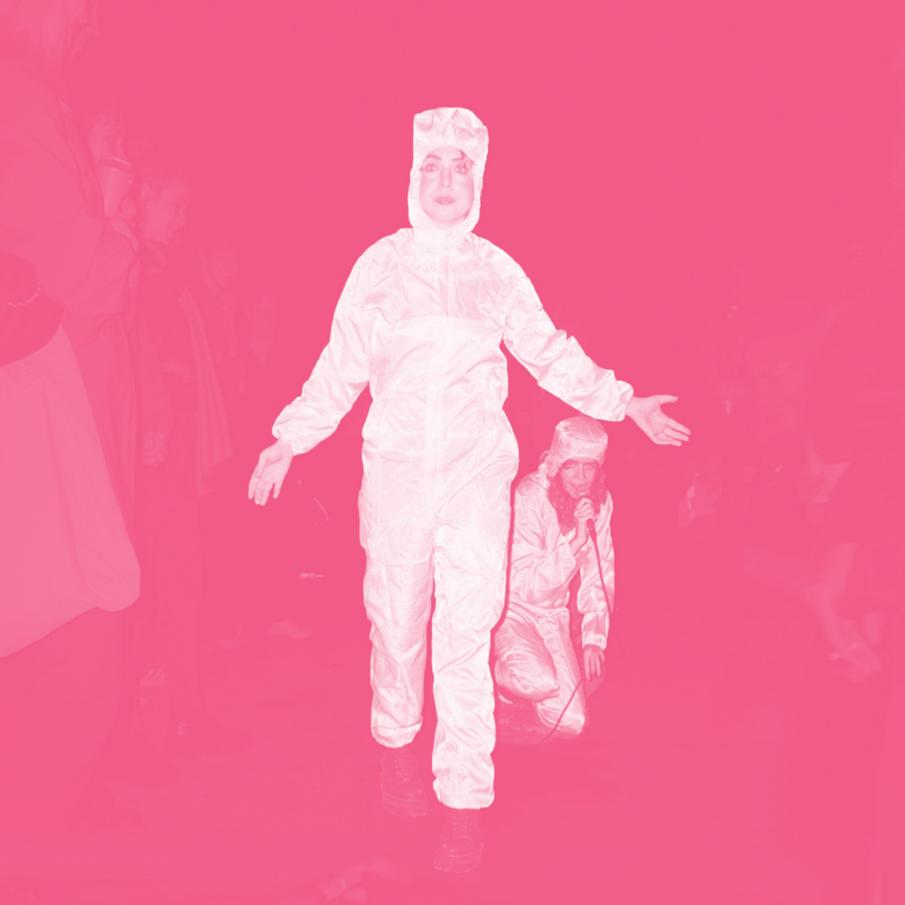 Säule will be filled with sounds between ritualistic noise, post-punk, digital deconstructions, and gabber, each with a unique performative edge that conjures portals to distinct worlds and fictions. Donning pink hazmat suits, a noisy, industrial, femme waste removal service is performed by Dreamgirls (Clíona Ní Laoi and Michelle Doyle) who have come to clean up all the waste, spray disinfectant, and remove human stains.