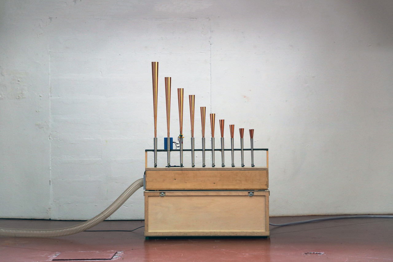 Existing in the liminal space between installation, environment, performance and concert, »Modular Organ System« is a multi-part instrument built from numerous sound generating objects that can be controlled by computer. Using established and novel construction methods as well as traditional and unconventional materials such as ceramic, wood, and plastic, the system was created through collaborations between visual artists, organ builders, technologists and artisans. As much a sculptural installation as it is an instrument, the heterogeneous structure’s openly visible components reveal the intricacy and adaptability of its design – pipes, wind chests, air hoses, electromechanical components are laid bare in their striking physicality.