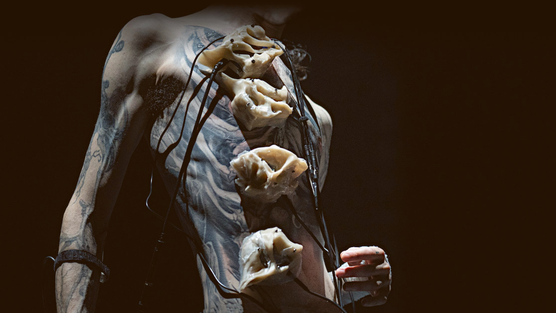 An exacting and sinuous ritual of sensory reorganisation, »Ex Silens« delves into the corporeal knowledge hiding at the edges of experience. It is a dreamlike encounter, yet raw and real. It is a reminiscence, a reverie surging through real-life accounts of modes of perception that are systematically rejected by the imperative of the normal. Here, cochlear implants, AI hearing algorithms, and amplifiers are extracted from their capitalist chain of production and subverted to create prostheses with their own agencies. Radically intimate, the prostheses are organs of sharing: they amplify sounds from the performer’s muscle, heartbeat, and blood flow, diffuse vibrations through the bodies of audience and performer, and in doing so, resonate sensible forms of being.