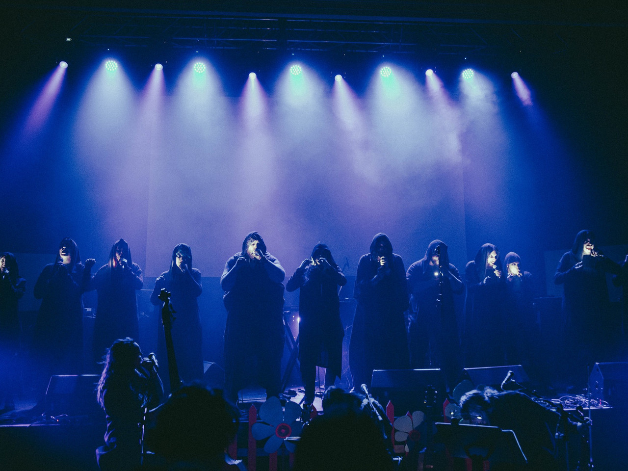 Growlers Choir is a cacophonic beast, howling in lurches that remain porous, so that beauty might ooze through in fragrant beads. Founded by composer Pierre-Luc Senécal in 2016, the choir is composed solely of metal vocalists, called »growlers,« coming from different metal subcultures. The compositions of the thirteen-piece ensemble split across low, mid, and high registers, combining wails, pig squeals, howls and shrieks with whispered breaths, ASMR textures and effects. The resulting entity metamorphoses between blackened metal pits into acappella compositions pulled gasping from hallowed places. One moment the mind is infused with electric feedback, machine-like drones, sweat-lapping beasts overlapping, then suddenly the air is hollowed by pure, unaccompanied choral harmonies. The ears shift constantly between tension and release.