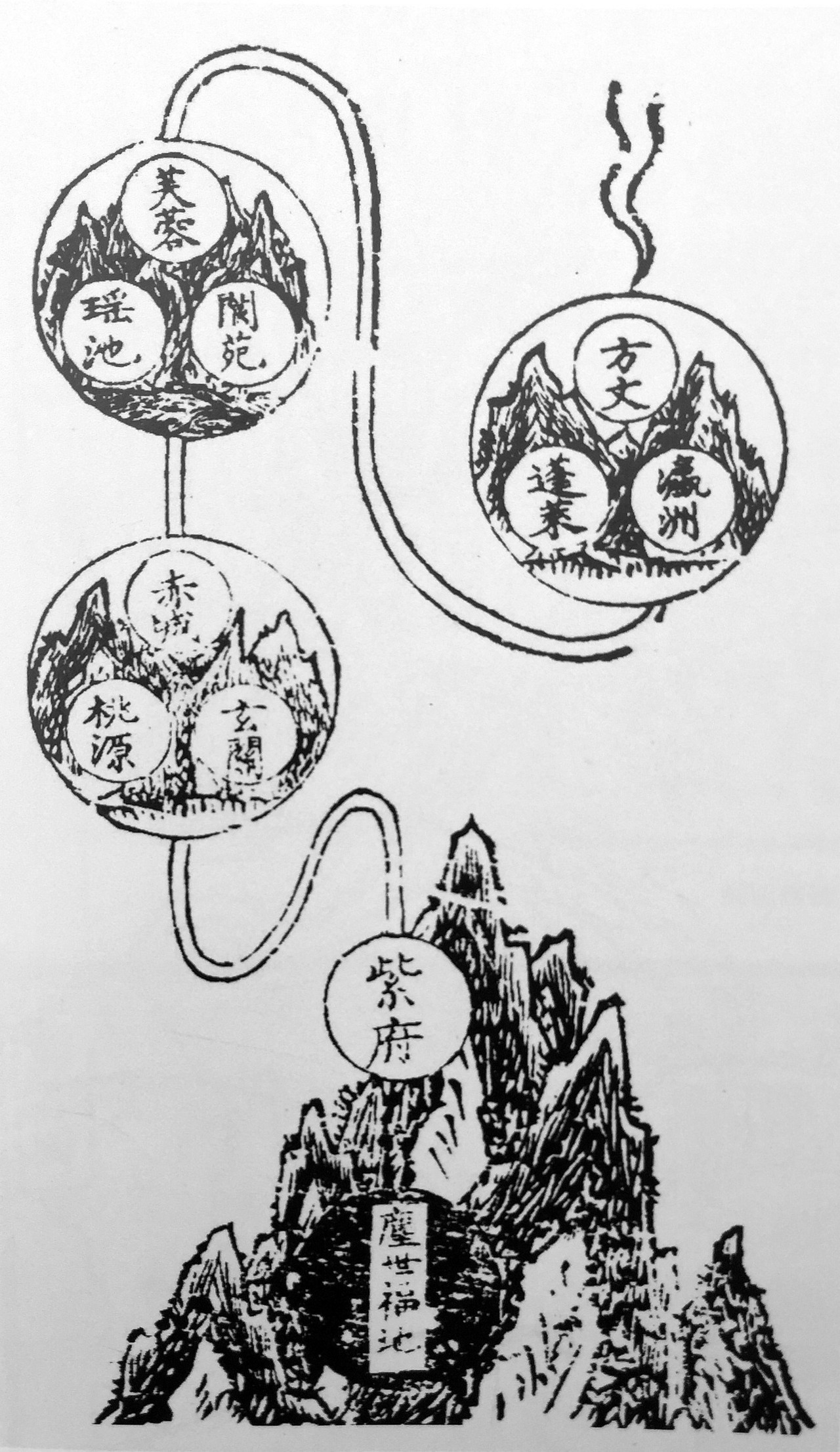 33: In Daoism, the place where the immortal sages practice their asceticism is called »Dong 洞 Tian天.«.Dong can be translated as a cave or a hole; and Tian refers to heaven, a non-earthly place. In this light, »Dong Tian« may suggest the celestial orifice...as »Dong« in Chinese embodies the concepts of a cave, a hole, and an orifice, alluding to secluded and sacred spaces. These realms are interlinked by a labyrinth of passages through which the immortals traverse. Legend holds that if a mortal stumbles into a »Dong Tian« and spends but a single day there, they may emerge to find that centuries have elapsed in the mortal world.