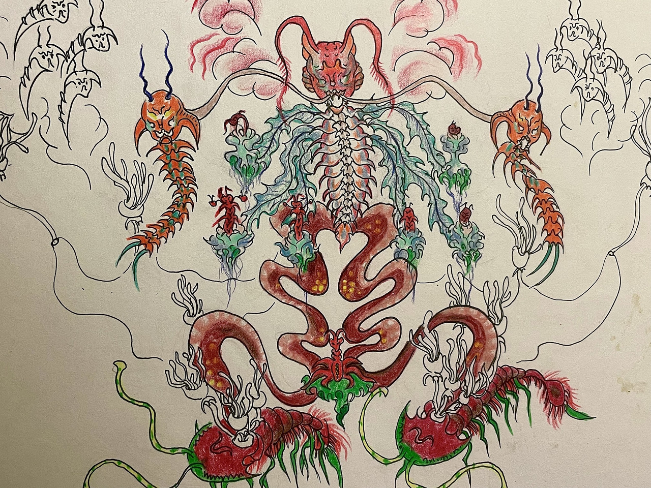 op: I think this is also a profound entanglement of ancient life forms with the pulsating rhythms and sound you created. I am reminded of your 2022 album Symbiosis Codes. In Chapter 1, Souls’ Return to the Drum, you conjured an archeological artefact from the fabled Arthropod Continent. Your words paint a vivid scene: »In the cave, I saw a multitude of paintings on the rocks – not mere animal forms, but visages adorned with insect tentacles. These tendrils intertwined, sprouting into new faces with antennae…Anyone who donned a mask with this pattern was seized by an unstoppable urge to dance.« This is a collective dream recorded in the scroll »Arthropod Continent Collective Dream Illustration,« dates unknown. Rock paintings, as an ancient art phenomenon, depict people's daily lives, rituals, and imaginations. During rituals, people communicate with spirits through the sound of drums and receive responses from ancestors. And the »insectoid tribe« and repetitive drumming are not just relics of the past.«