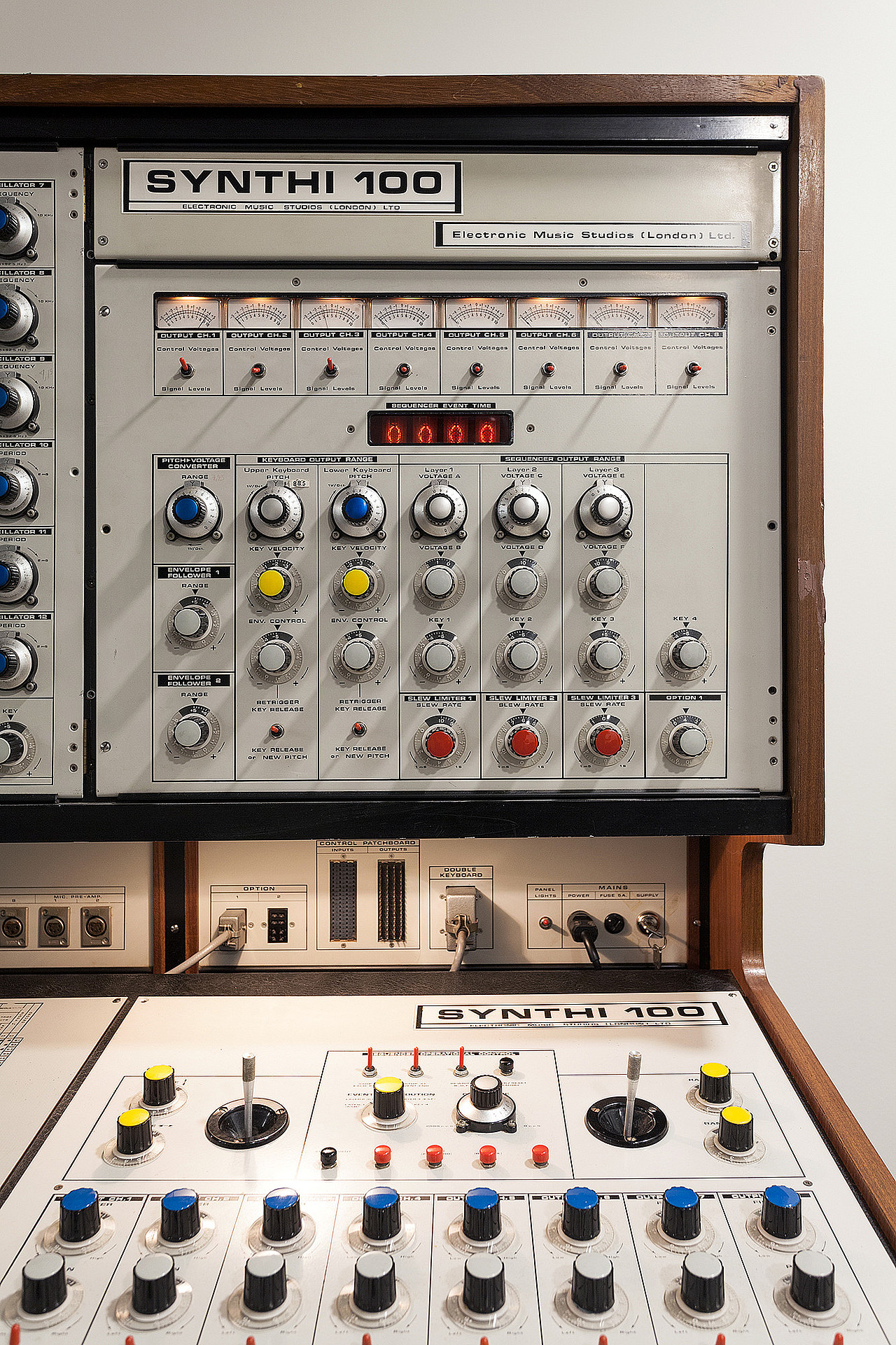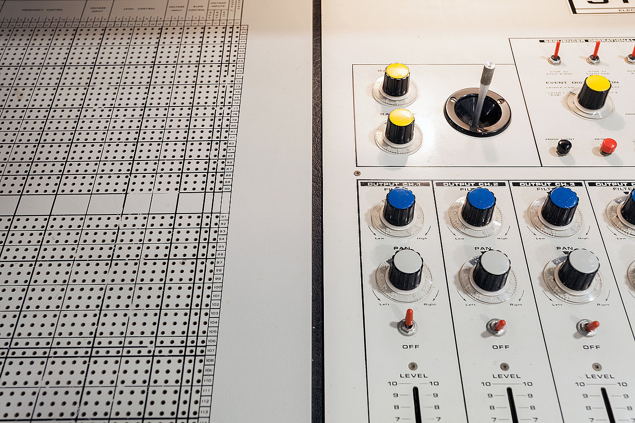 Another instrument, the Synthi100, has an intimidating presence. A digital / analogue hybrid synthesiser, it was EMS’s largest model intended to function as a complete stand-alone production studio. Procured at some point in the 1970s and used briefly in the first years of CMRC, it subsequently fell into disuse and disrepair. In 2016-17 it was repaired as part of a collaborative project between the CMRC and the Documenta 14 exhibition, which took place in Athens. The whole project was coordinated by Marinos Koutsomichalis and culminated in a residency with four musicians that premiered original works using the Synthi100 (Panos Alexiadis, Lisa Stenberg, Jonas Broberg, and Koutsomichalis himself) at the Megaron Concert Hall in Athens. Koutsomichalis recalls how the aspiration behind the refurbishment of the instrument was twofold, to revitalise CMRC activities with artist residencies organised around the Synthi100 and »to really make the most of this unique underused piece of equipment as an instrument in its own right, not just as a sample source.« Since its restoration many international artists have had the opportunity to work with the instrument and record new music as part of an ongoing residency in the new studio at the Athens Conservatory (Anna Zaradny, Zoe Efstathiou Stelios Giannoulakis, Jørgen Teller and Egil Kalman among them). Composer Paul Pignon, who co-designed the Synthi100, visited the CMRC in person and coordinated a workshop/performance in 2019.