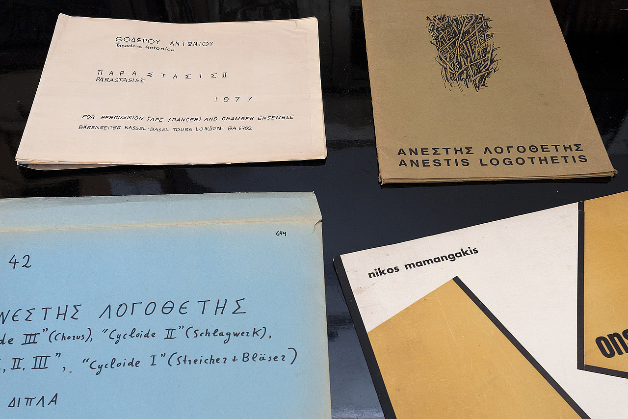 As all archives, the CMRC archive presents a narrative. It is the story of Greek avant-garde music and the primary narrator is John G. Papaioannou. Most of the archival material that covers the period from the 1930s until 1979 is largely drawn from his own collection which was back then already an authoritative archive of 20th century Greek music. The story that it tells begins with seminal composer Nikos Skalkottas (1904 – 1949), whose personal archive Papaioannou cared for and disseminated after Skalkottas' passing. Another big part of the archive is connected to a group of composers that were showcased during the »Hellenic Contemporary Music Weeks,« a series of events that had created a sense of cohesion in that loose heterogeneous circle of composers. They perceived themselves as the new Greek avant-garde and that is how Papaioannou had presented their activities, as both a part of the Western musical avant-garde (many among them had studied outside of Greece) and also decidedly Greek. Most of them aspired to attune themselves with what was happening in the international contemporary music and art scene. They began to experiment with electronic instruments, musique concrete techniques, and other new music currents, without necessarily doing away completely with acoustic instruments and more conventional compositions. Ancient Greek mythology, philosophy, and theatre appear to be a recurring source of inspiration for many of them. Some tried intently to re-contextualise Greek folk and Byzantine music traditions in ways that give a pre-eminent position to mysticism and ritual. In this broad milieu we find figures like Jani Christou, Anestis Logothetis, Michael Adamis,Theodore Antoniou, Nikos Mamagakis, Yorgos Sicilianos, Dimitris Dragatakis, Dimitris Terzakis, and George Leotsakos.