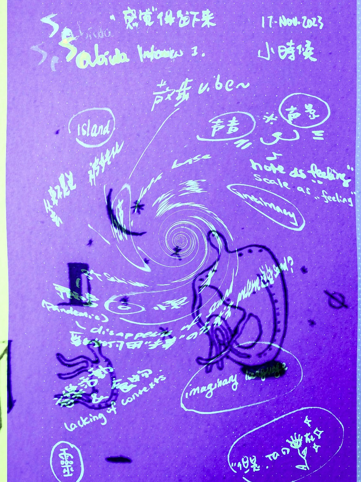 柏林某個初秋的午後,Sabiwa邀請我去她溫馨的小家喝茶。此刻,當我“回憶”我們初次相遇,我依然能感受到窗外的涼意和洗衣機轉動的奇妙聲響。我們像兩只貓咪,蜷縮在辛香餅幹的溫暖和草本茶的騰騰熱氣之中——那是Sabiwa帶著意識與正念,小心翼翼地帶我盤旋而上,進入未來風景的回憶。島嶼上,聲音像植物般美妙滋長。但那裡也不僅僅只有聲音…