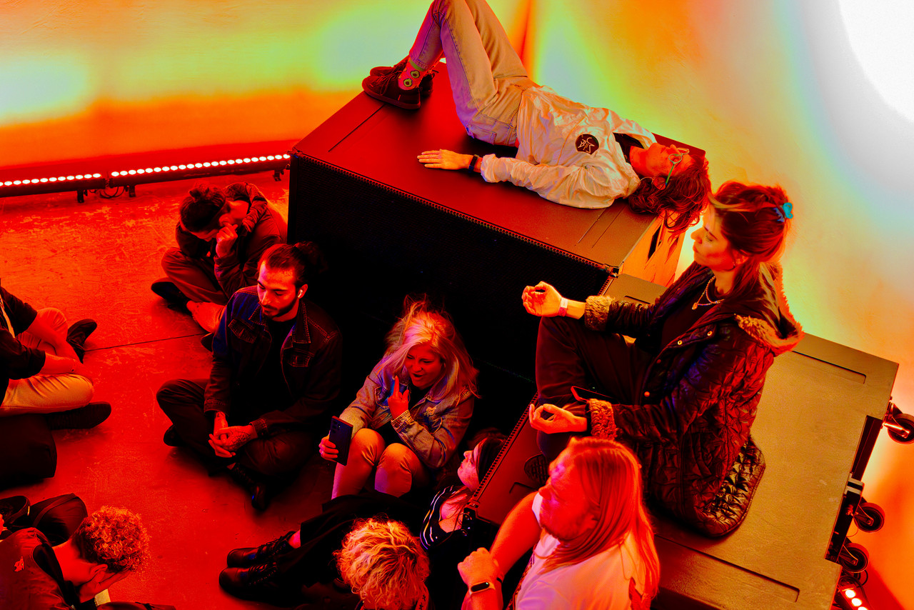 In these moments, the individual’s somatosensory system shifts their perception, reconfiguring the experience of reality in ways that bypass logical cognition and instead amplify the body’s capacity to »feel« the present. The act of feeling the sub-bass becomes the guide – also in interconnection with other participants. This mode of perception often induces an altered sense of time – either through the dilation or contraction of time – along with sensations of invigoration, excitement, or even the relief of pain. By reorienting the individual’s experience of reality away from rationality, B.A.S. opens up a space where time and bodily and social sensations intermingle, enabling a deeply personal and transformative encounter with sound. In this context, low-frequency sound does not simply stimulate the auditory system; it becomes a conduit for a multisensory, embodied re-imagining of space and time, emphasising the body’s central role in shaping subjective experiences of a commonly shared reality.