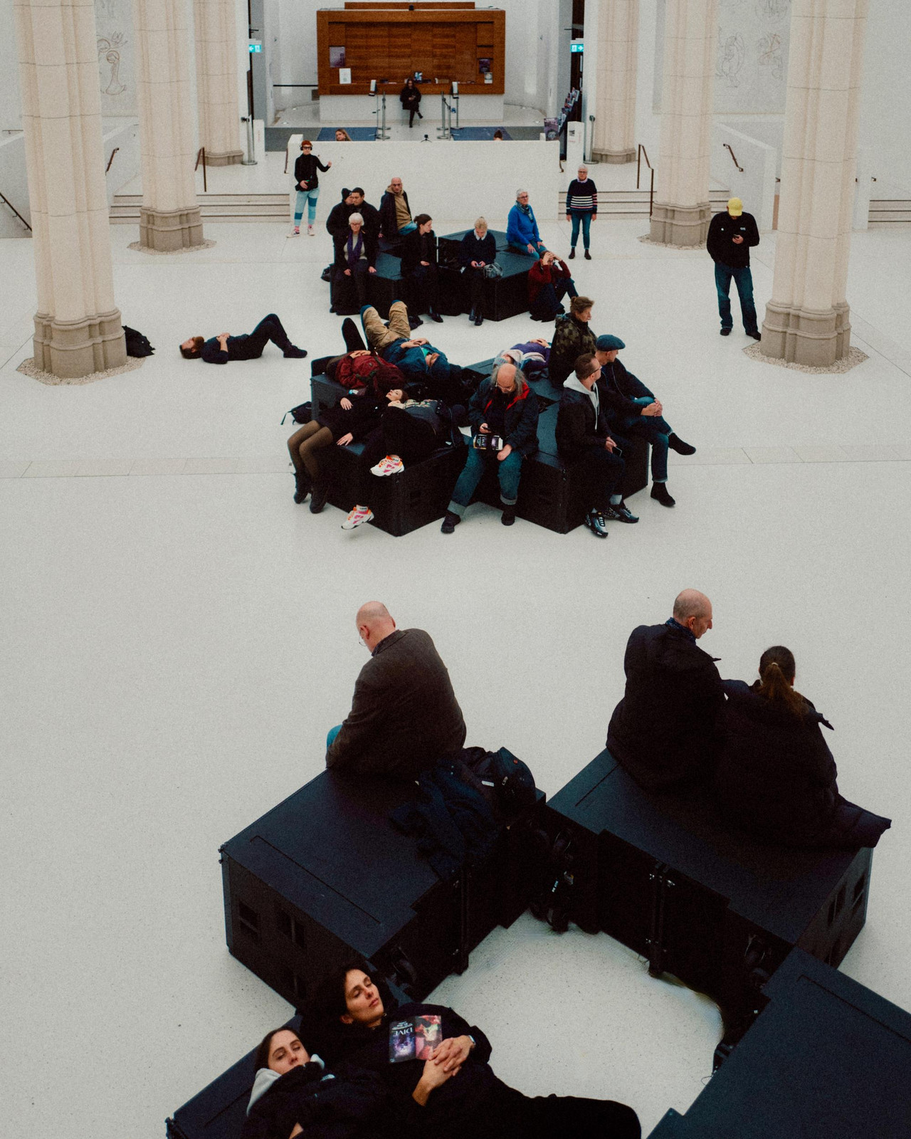 The sonic environments explored in B.A.S. emphasise the agency of the individual in assessing, even if subjectively, how they will experience sound, positioning the body as both a receptor and a co-creator within the sensory landscape. Each individual has the freedom to navigate the installation space, either by moving through the room in search of resonances and reflections or by reclining, opting to disconnect from the structured, logical demands of reality and instead attuning themselves to the feeling of sound as a tactile and immersive medium. This mode of engagement highlights a shift from passive listening to an active, embodied experience where the body is not merely responding to sound but, in fact, becomes a co-source of sound itself. As low-frequency vibrations pass through the body, they provoke internal responses that resonate back into the environment, turning the body into a dynamic participant in the creation of the sonic and social experience. This active co-creation extends beyond the mere physical response to sound and engages with alternate modes of experiencing space and time and being in space and time with other humans.