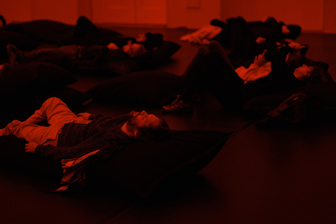 But what happens with LFS exactly? Lying down in a room, untouched by anything, one feels something with the entire body. It is like a sonic massage – not a traditional one. The sound waves act like hands, disturbing the air molecules and gently caressing the skin. One is reminded of Alvin Lucier’s sound art piece »I Am Sitting in a Room,« which works with resonances of a space. Yet, sonic massage is not about how sound reshapes itself in space – it is about how it reshapes someone. The sound not only moves through the room, it moves through you, bypassing the ears and connecting directly to the body, the bones, and the flesh.