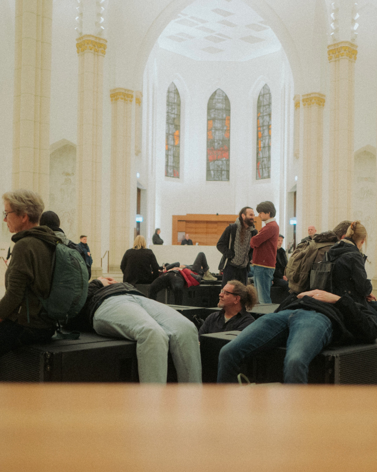 Within the frequency spectrum – the complete range of sound frequencies audible to humans, typically spanning from 20Hz (the lowest edge of human hearing, often associated with deep sub-bass vibrations of low frequencies) to 20kHz (the highest, sharpest pitches perceptible to the ear) – I came to understand that low frequencies must be composed and arranged based on their interactions with the body, rather than focusing on the space or relying solely on auditory perception. In this process, the body becomes the primary decision-maker in determining whether a tone is included in a piece. Each tone is approached by asking: In what way does this sound touch someone? Does it feel like a positive sonic touch, defined as a sound that elicits sensory satisfaction? This means to promote relaxation and avoid sensory discomfort by maintaining a balance between intensity and frequency – strong enough to be engaging but gentle enough to remain calming and agreeable on the body. Or is it activating a resonance in the room that creates unwanted, negative effects – such as vibrations that are overly harsh, leading to irritation?