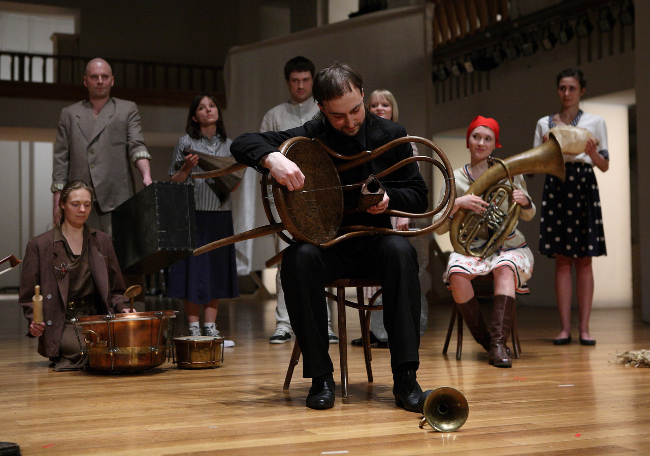 Probably one of the most distinct features of the Russian noise movements of the time is the absence of a single predominant tendency, whether rooted in Futurist ideas or other schools. One may refer to Constantin Stanislavski’s autobiography, My Life in Art, in which the theatre director recalls a production titled The Snow Maiden from 1900, which featured a backstage noise orchestra consisting of »whistles, castanets, and other machines, many of them invented by ourselves for the purpose of making peculiar noises.« This and other references to stage practices at the turn of the 20th century reveal that theatre in particular made increasing use of noises. Yet the case of The Snow Maiden shows a fascinating correspondence with noise accompaniment not uncommon in medieval Russian folk traditions. Relics of the vast skomorokh tradition, which is characterised by the use of unconventional self-made instruments or just ordinary objects, have partially survived in the practice of musical eccentrics. Many such traditions, employed by musical clowns at the turn of the century, shifted to avant-garde theatrical circles in the early 1920s. Within the exhibition Generation Z: ReNoise, a number of such eccentric musical devices, reconstructed by The Music Laboratory group2 will be exhibited: a bottlephone (a percussion instrument with hanging bottles), a pig bladder and vein »string« attached to a mop, a saucepan drum, and others.