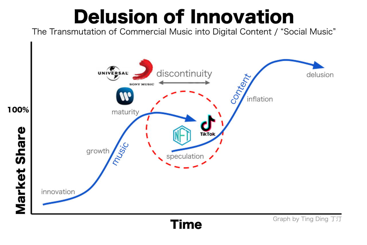 To briefly recap, album sales, as well as music retailers as a whole, have been in sharp decline since 2001, with streaming services such as Spotify capitalising on the untapped wealth of music catalogues in an increasingly oversaturated digital market. In August of 2020, my statistical analyst partner Ting Ding 丁汀 and I wrote a music revenue report called »Edging the Glass Cliff,« in anticipation of a new age of aspirational, or delusional, greed and financialisation initiated by content producers and amateur tycoons, pontificating amid diminishing expectations from the general consumer population and multiple waves of mass death. After a decade of failed and failing ventures in paid media advertising, global PR campaigns, and an industry-wide pivot from text to image to video-oriented content – which was proven to be inflated and manipulated by hosting platforms like Facebook as far back as 2016 – the music industry has found itself in a place in which we can’t seem to remember why we even listen to, let alone, pay for music. Empty promises of saving a dying – now dead – music industry with a shift in focus away from the current long term contractual scam to multiple work-in-progress »alternatives« have occupied the misguided thoughts of majority white male analysts who neither consume nor produce nor listen to music, but feel the need to monopolise the remaining scraps of music value in order to revitalise, repurpose, and repackage what is essentially leftover dead stock from a music industry of yesteryear towards a flaccid and unsustainable future of culture.