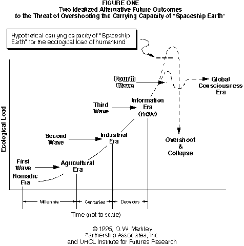 Largely left out of the closed-circuit collective drug-induced psychosis of the UK and European electronic dance music industry reminiscent of the »dancing plague of 1518«, the US industrial complex was tipping over into what Alvin Toffler described as a »corporate identity crisis,« in which the mass market demographics that defined the industrial era of civilisation were beginning to shrink and split into the »ever-multiplying, ever-changing sets of mini-markets that demand a continually expanding range of options, models, types, sizes, colors, and customizations« associated with the shortsighted, tragically myopic, and data-obsessed information era. Toffler explained that the acceleration of transactions amongst subdividing consumer demographics that ought to be thought of as individual human beings would dramatically peak before reaching a »general crisis of industrial civilizations as a whole,« writing that »unlike any other crisis in history,« this economic crisis would »bring inflation and unemployment simultaneously, not sequentially.« This could be correlated to the effects of Covid-19 and our present crisis, given that the »now« in Toffler’s chart below represented the year 1980. Fourth Wave options of the utopian global consciousness era, or the more realistic outcome of an overshoot and collapse, were placed around the year 2020.