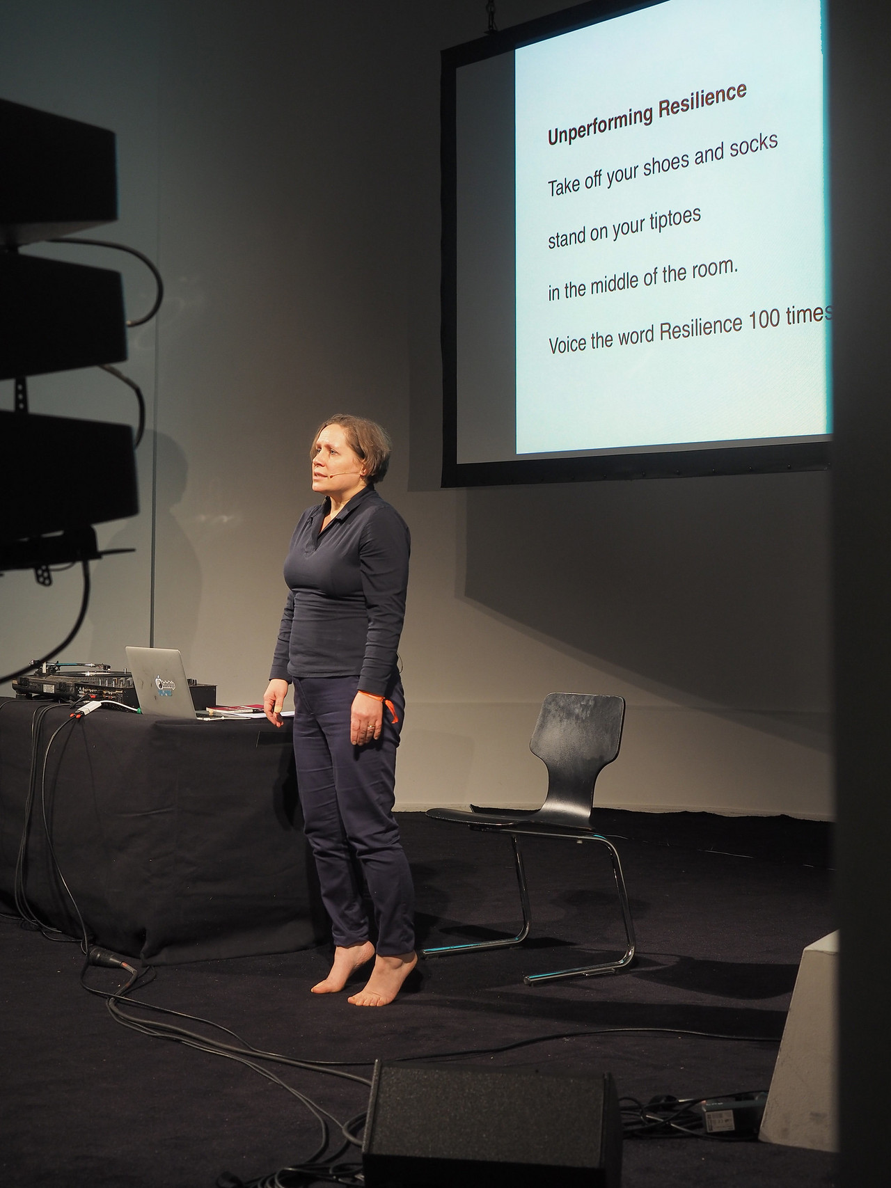By contrast, in our unperformance of vowels and consonants, in an extended and unnatural pose, on the tips of our toes, we expose the development of a word from the scientific sense of ecological adaptation into a dubious economic elasticity: instituting the neoliberal response to asymmetrical resourcing that prepares the mind and body for the tolerance of an intolerable world, offering solutions on the stretched-out form of the resilient individual without having to address causes or consequences, thereby abdicating collective responsibility in favour of personal blame.